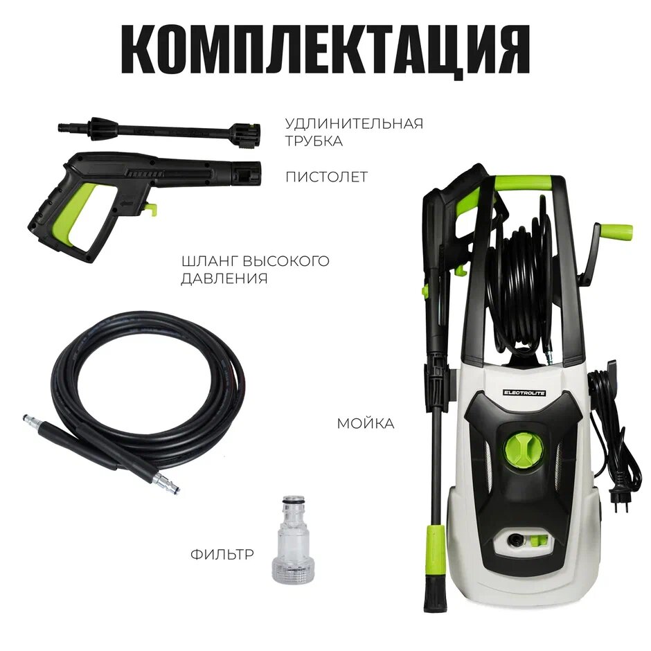 Мойка высокого давления для автомобиля / Минимойка для дома с забором воды из емкости / Автомойка Electrolite 2350 ( 2300 Вт, 120-150 бар давление, 420 л/час, металл. помпа ) интересное:
