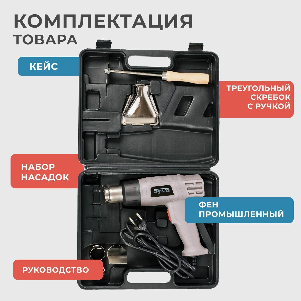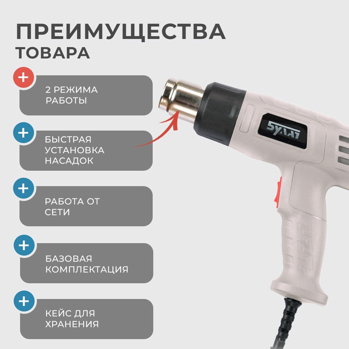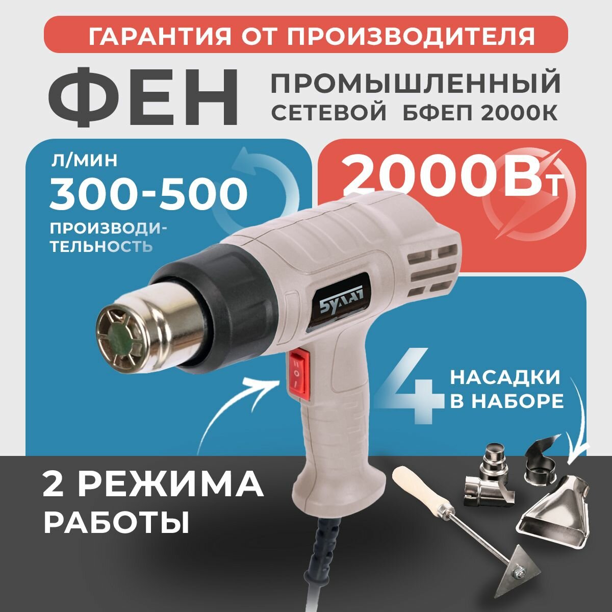 Фен строительный / термопистолет булат бфеп 2000К, 2000 Вт, кейс, насадки, 2 режима