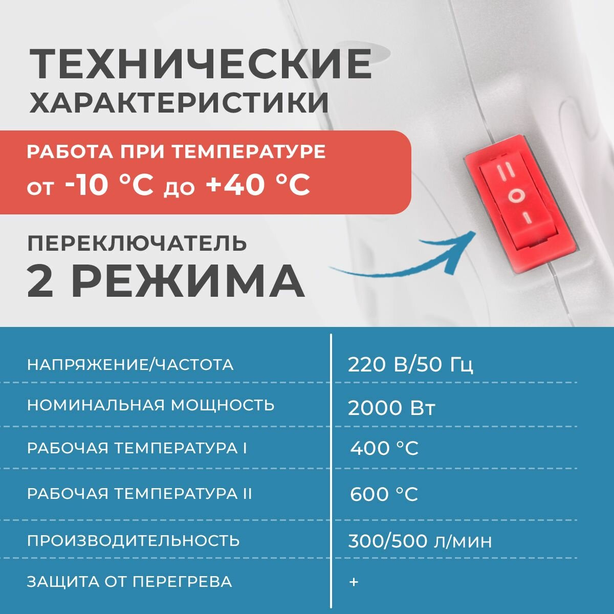 Фен технический (строительный), ЗУБР ФТ-2000, насадки 3 шт, 2 режима: 350град/ 350л/мин, 650град/ 550л/мин, коробка, 2000Вт