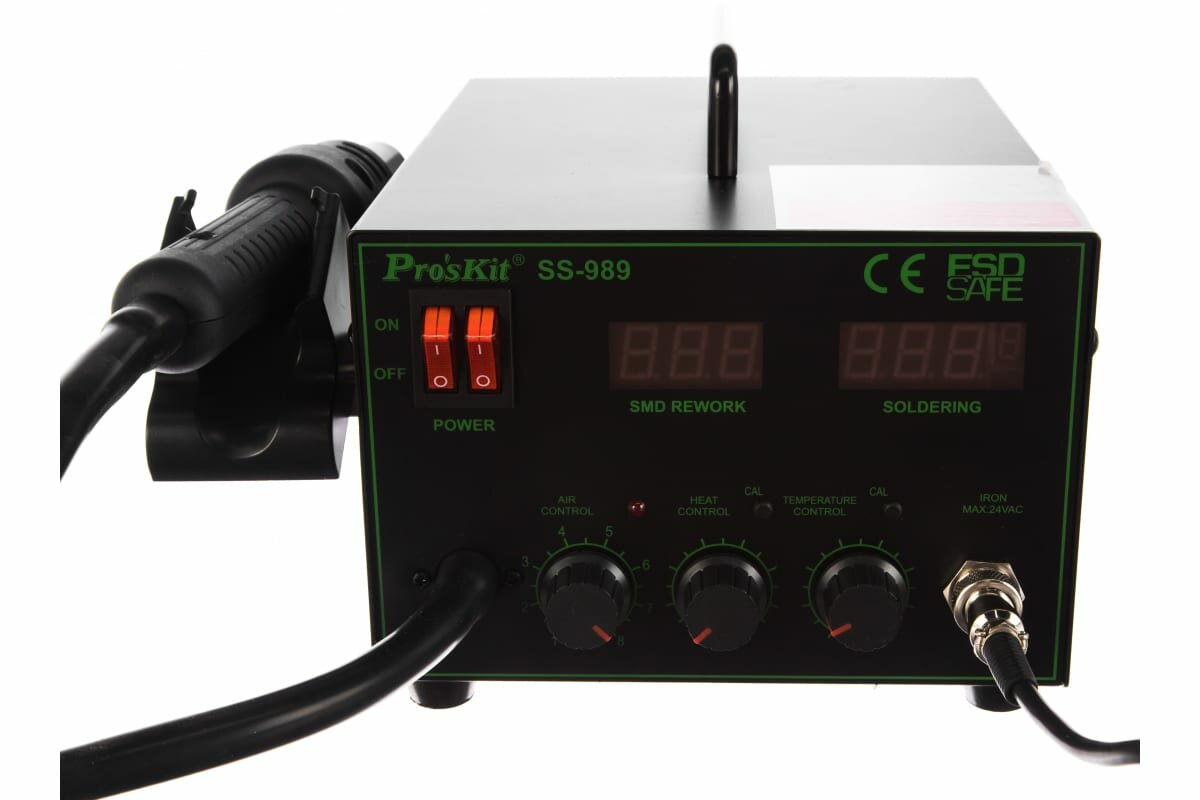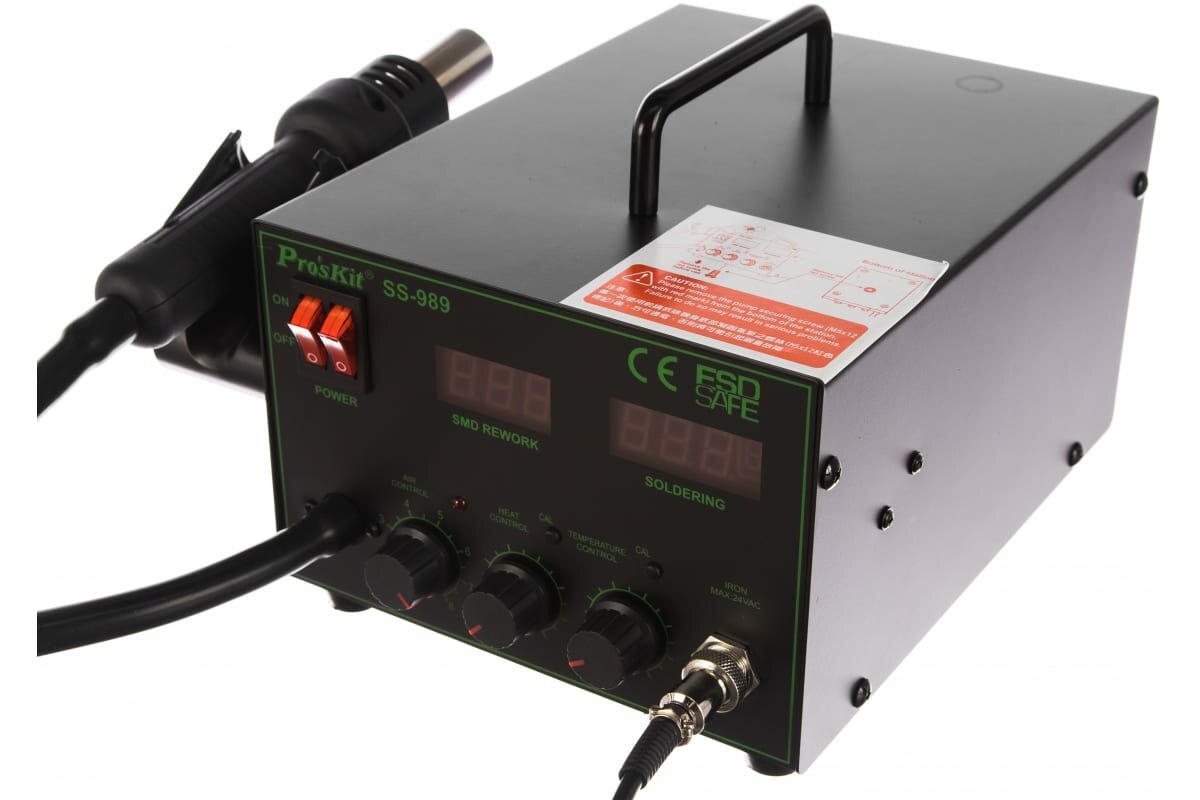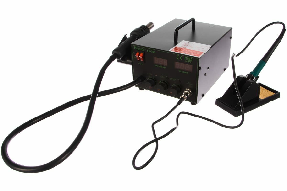 Купить Паяльная станция Pro'skit SS-989B, паяльник 60Вт, двухканальная, воздушный поток фена 24л/мин, 220В, 200~450°С, ЖК-дисплей, антистатическая защита