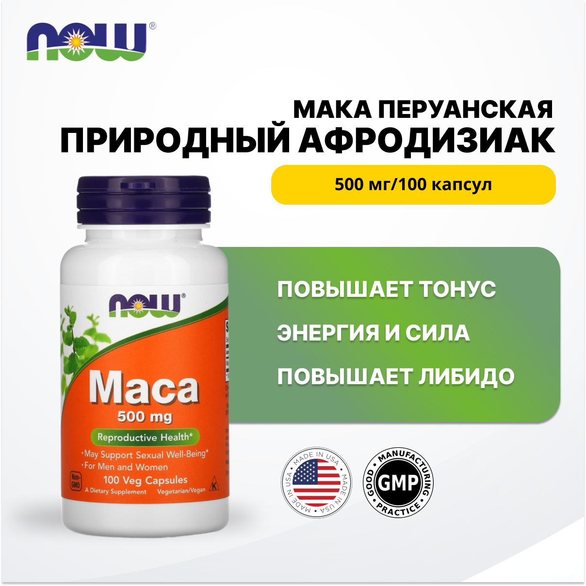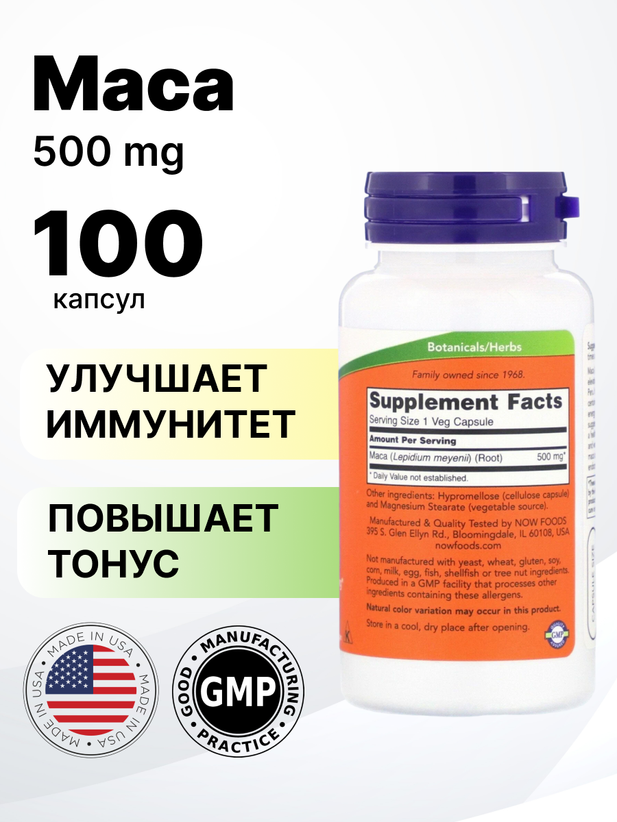 NOW Foods, мака, 500 мг, 100 растительных капсул, средство для улучшения потенции, повышения энергии и либидо