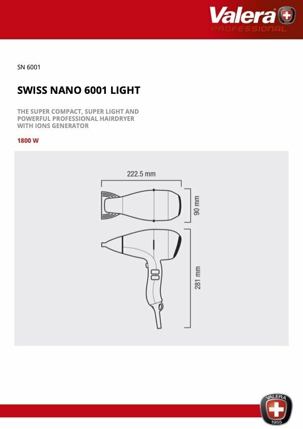 Фен Valera Professional Swiss Nano 6001 (SN 6001), мощность 1800 Вт, DC-мотор.