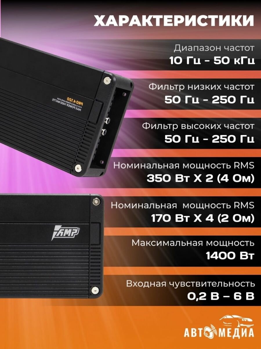 Усилитель автомобильный AMP PRO 4.120, 120 Вт х 4 (4 ом), 1400 Вт, Класс: D интересное: