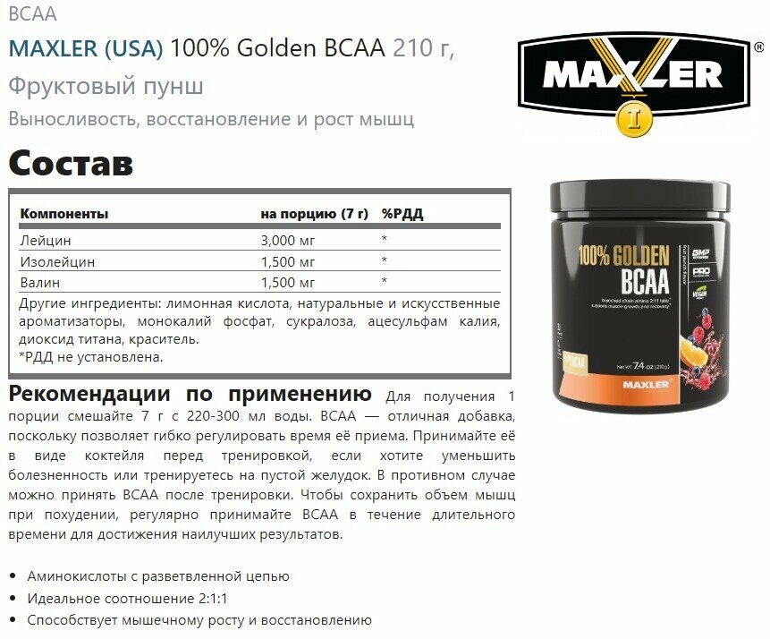 Купить Аминокислоты Maxler 100% Golden BCAA (2:1:1) 210 гр. - Фруктовый пунш