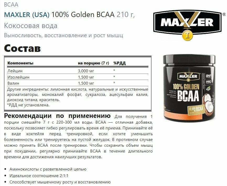 Ниже Вы можете прочитать отзывы на BCAA Maxler 100% Golden, кокосовая вода, 210 гр., ознакомится с подробными характеристиками, посмотреть интересные обзоры и фотографии на BCAA Maxler 100% Golden, кокосовая вода, 210 гр..
