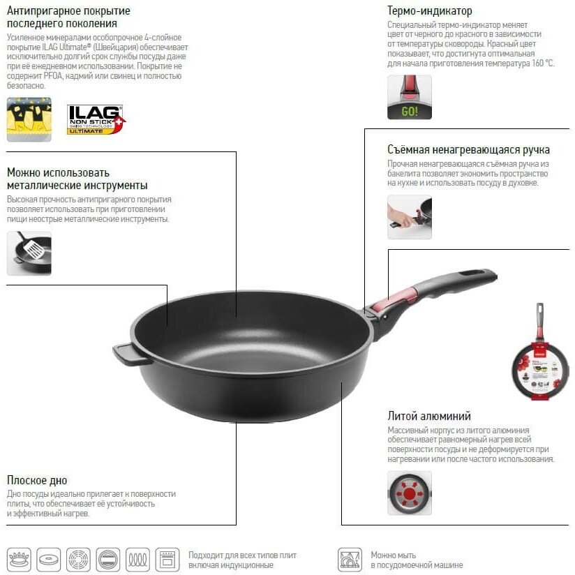| Дополнительная информация | материал ручки: бакелит; индикатор нагрева: есть; марка антипригарного покрытия ILAG Ultimate |