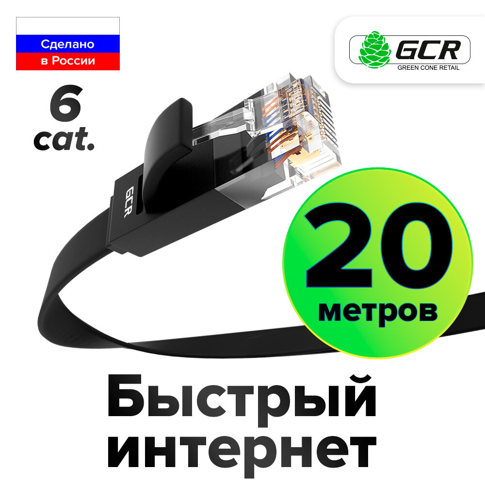 Патч-корд 20м GCR PROF плоский UTP cat.6 10 Гбит/с RJ45 LAN кабель для интернета контакты 24K GOLD (GCR-LNC62) зеленый