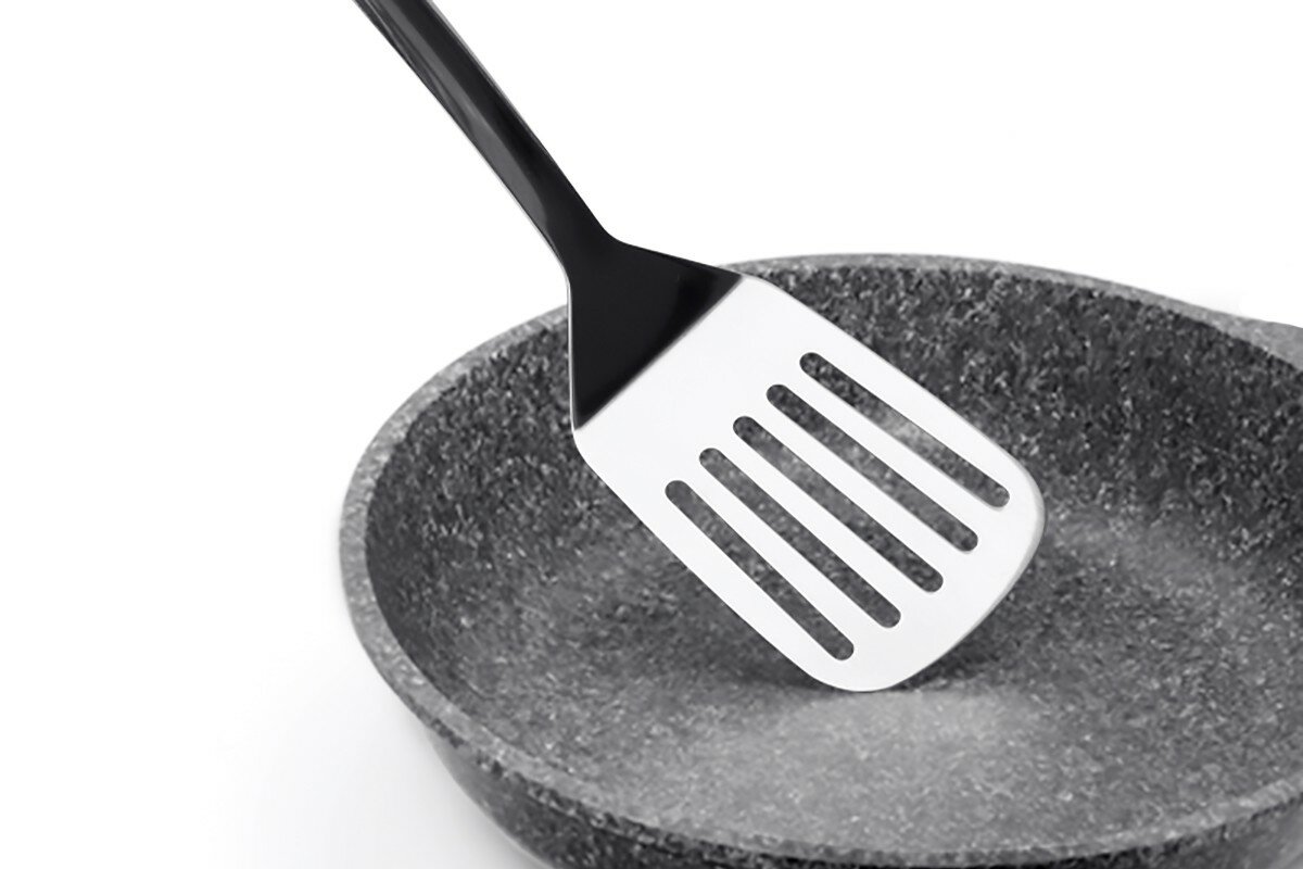 | Плюсы: | приятный на ощупь и круто выглядящий материал ручки. необычный материал покрытия сковороды.