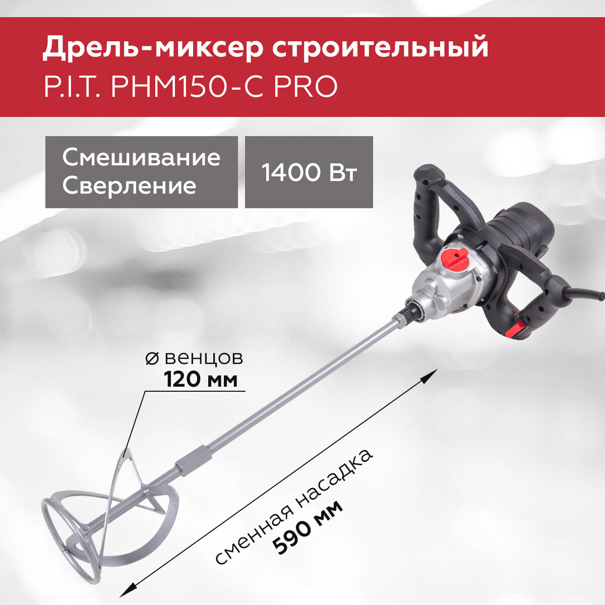 Миксер строительный электрический от сети P.I.T. PHM150-С, 220 В, 1400 Вт, 500-700 об/мин / электродрель ПИТ для перемешивания смесей, краски