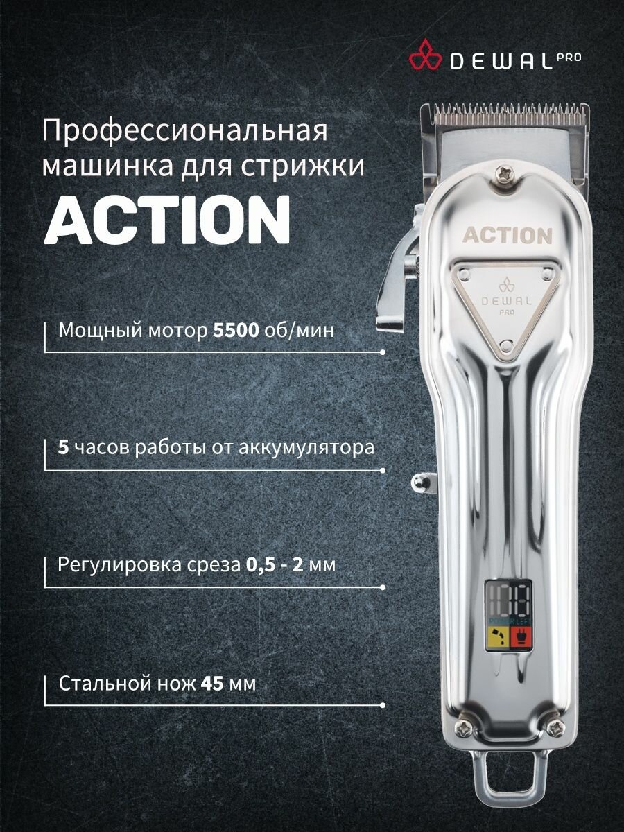 Dewal Машинка для стрижки Action, аккум\сет, 5500об\мин, 45 мм, серебристый