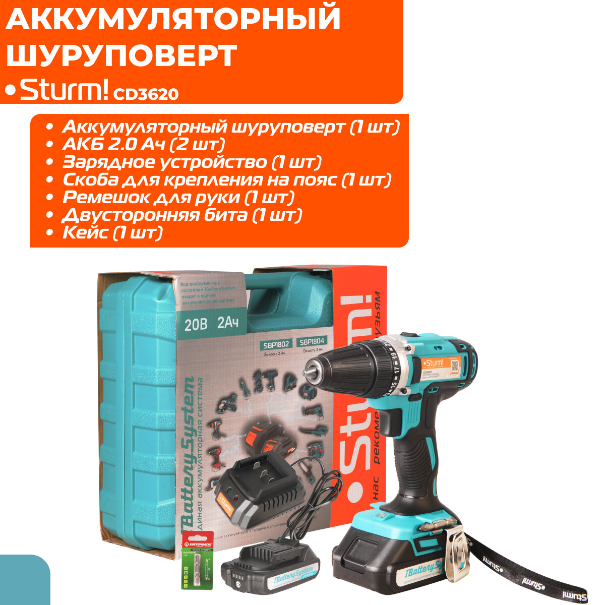 CD3620 Дрель аккумуляторная Sturm!, 20 В, 1BatterySystem, 2 акк., 2,0 Ач, кейс Sturm!