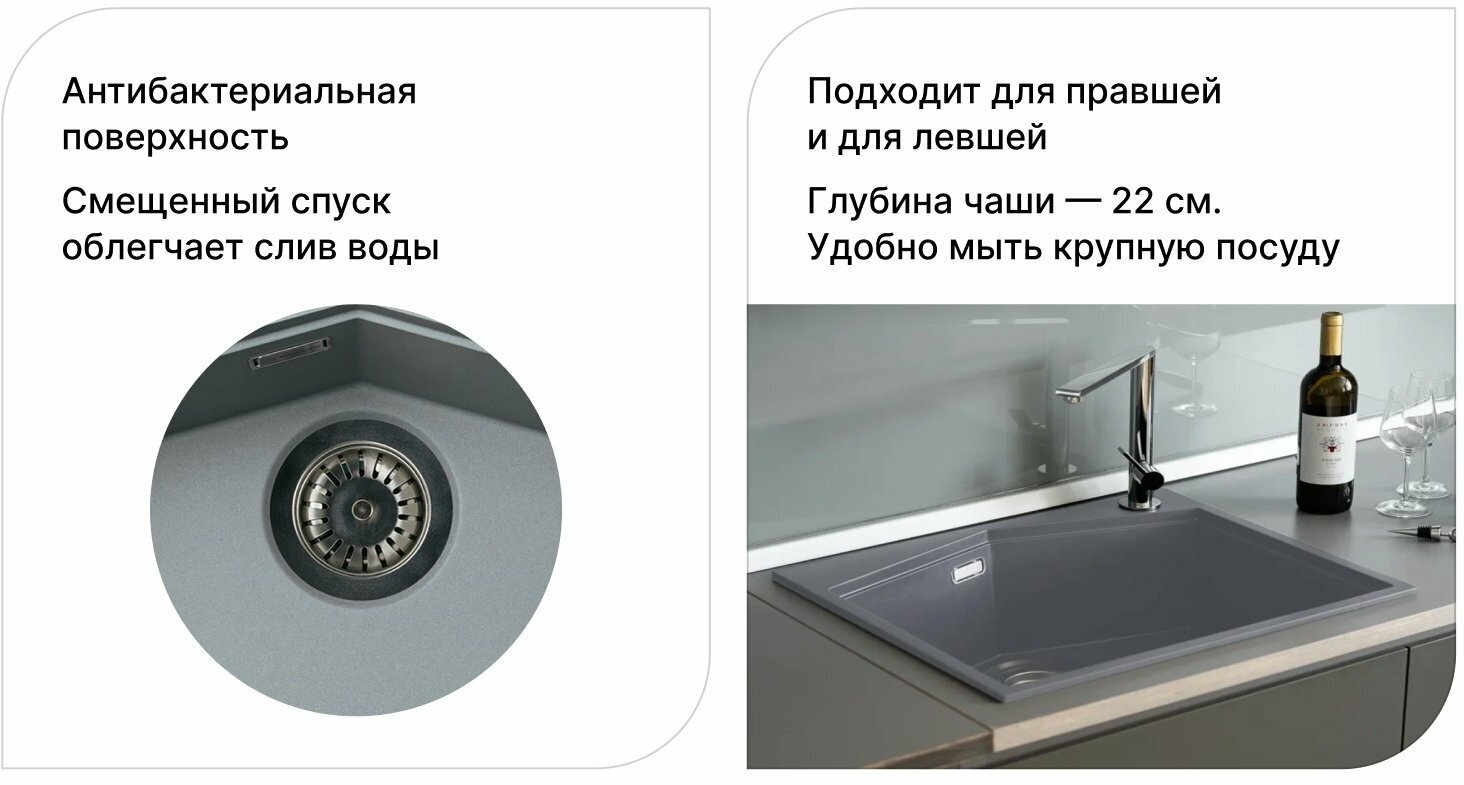 | Плюсы: | данная модель из капсульной коллекции кухонных моек бренда Kit Kraken. Видно, что поработали дизайнеры, учтены современные тенденции. Kit Kraken это точное прочтение минимализма и скандинавской эргономики.