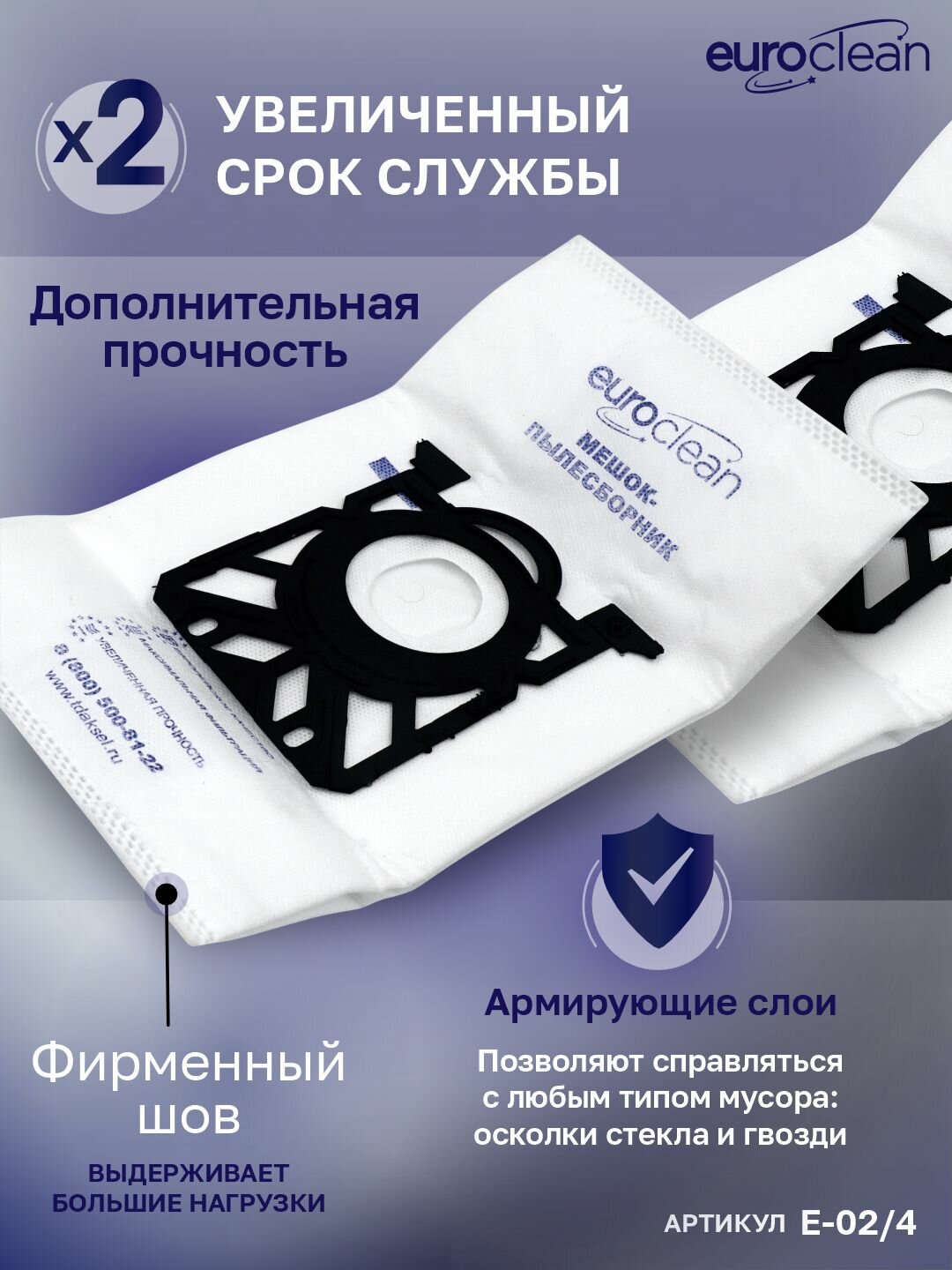 Ниже Вы можете прочитать отзывы на Euroclean Синтетические пылесборники E-02/4, 4 шт., ознакомится с подробными характеристиками, посмотреть интересные обзоры и фотографии на Euroclean Синтетические пылесборники E-02/4, 4 шт..