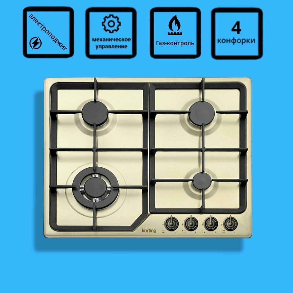 Газовая варочная панель Korting HG 630 CTSB, бежевая, эмалированная сталь, газ-контроль, электроподжиг, чугунные держатели для посуды, WOK-конфорка, безопасное управление, ретро дизайн