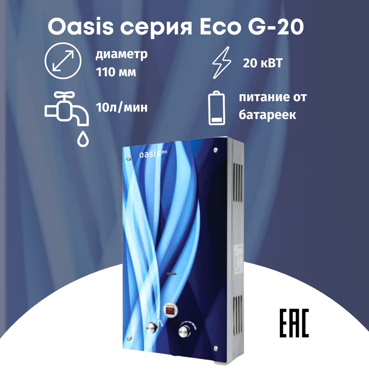 Купить Газовая колонка Oasis Eco G-20 Голубое пламя, 20 кВт, 10 л/м. Энергонезависимая Работа при пониженном давлении воды Специальный сетчатый фильтр Высокий КПД LCD дисплей