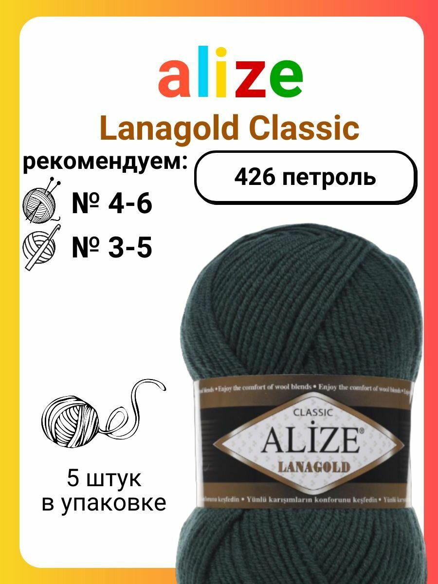 Купить Пряжа ALIZE Lana Gold цвет 426 темно-зеленый черно-зеленый Лана Голд 1 упаковка 5 мотков по 100г по 240м, турецкая полушерсть, теплая, мягкая нить
