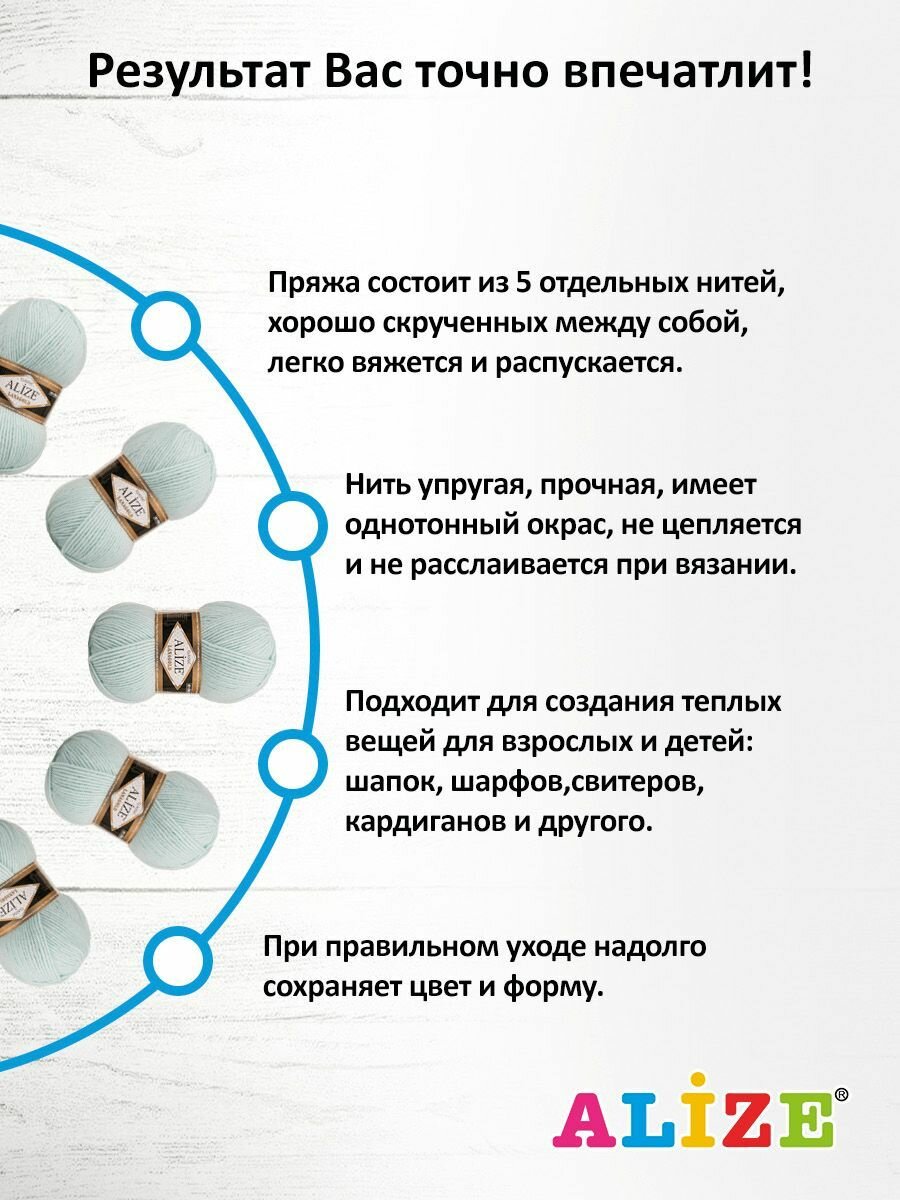 СохранитьПряжа ALIZE Lana Gold цвет 522 мятный Лана Голд 1 упаковка 5 мотков по 100г по 240м, турецкая полушерсть, теплая, мягкая нить интересное: