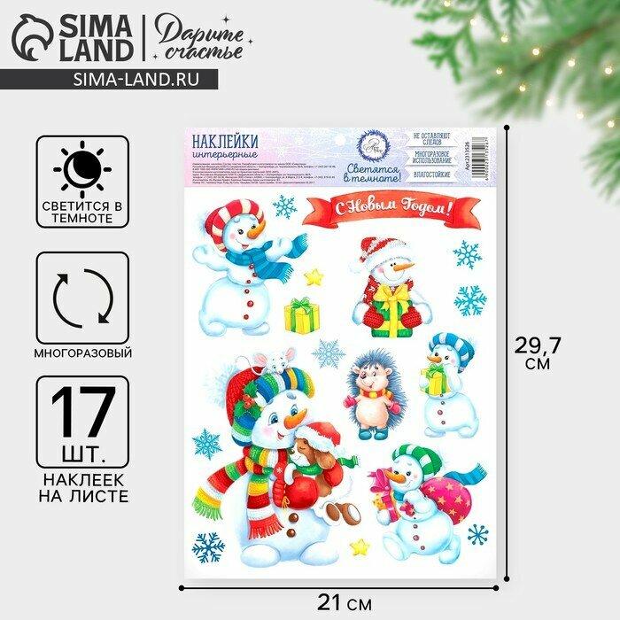 Интерьерная наклейка со светящимся слоем «Снеговички», 21 х 29,7 см интересное: