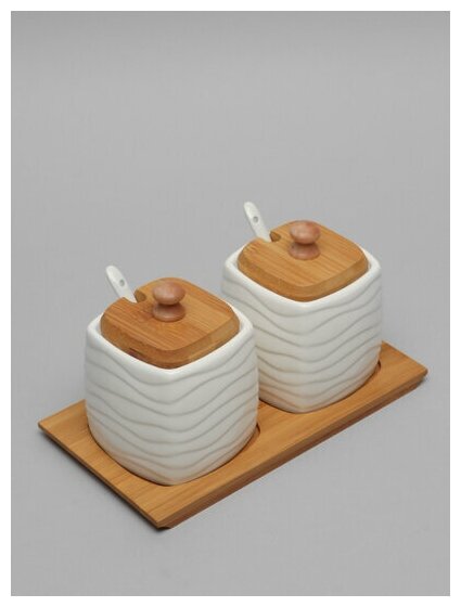 Набор банок 2шт с ложками на бамбуковой подставке "Naturel" 21*11*11 v =320мл фарф.