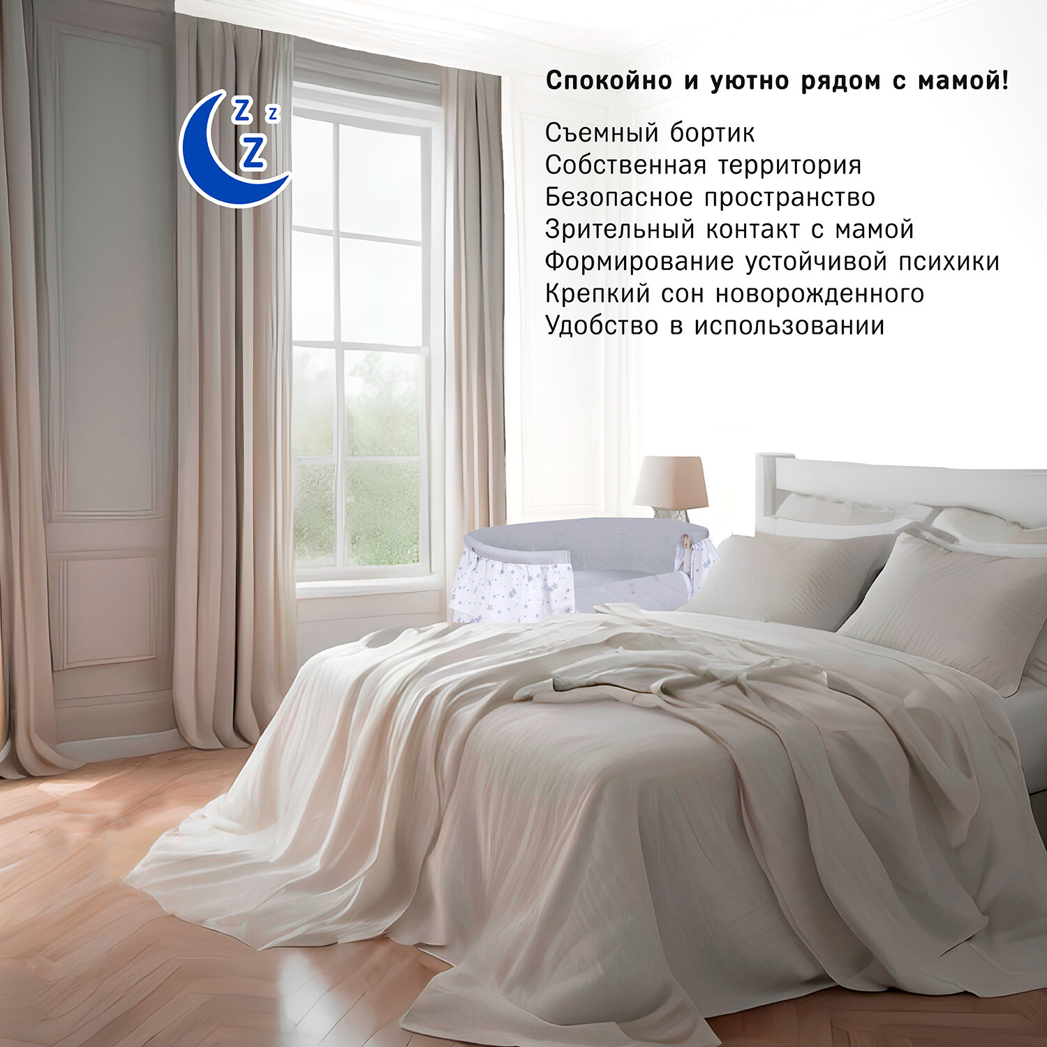 | Отзыв: | Сначала поставили просто рядом с кроватью, а потом все таки пристегнули к кровати, удобней когда ребенок спит рядом, особенно ночью. Приставной вариант установки все таки приоритетней. Вибророежим есть, колики нас крайне редко беспокоят, мы на ГВ, но если и есть, то виброрежимом пользуемся, помогает успокоить ребенка. |