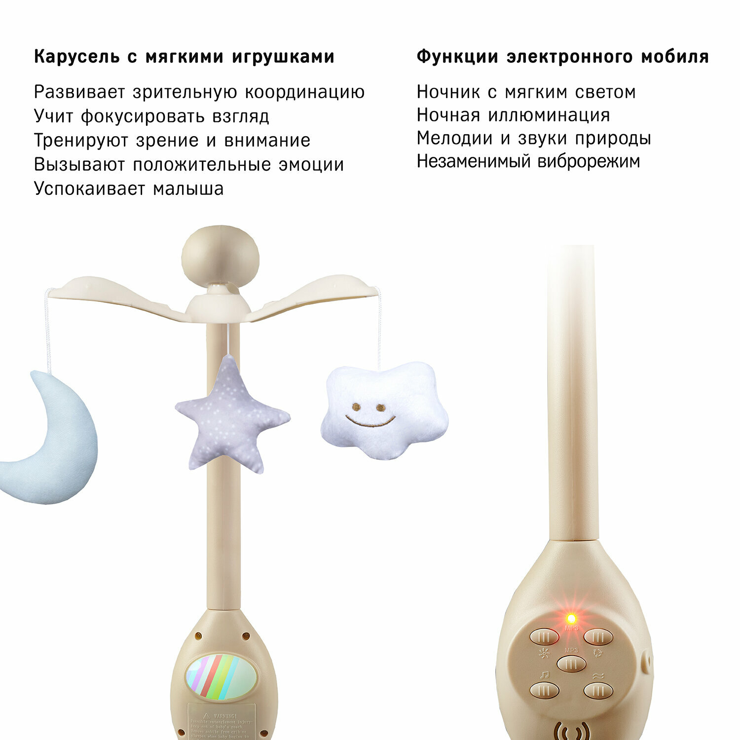 | Плюсы: | игрушки вращаются под музыку, есть виброрежим, он помогает ребенку снять напряжение во время коликов |