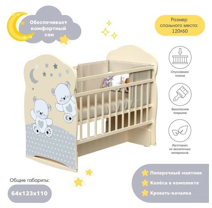 Кроватка детская для новорожденных ВДК Funny Bears, колесо-качалка, массив березы, слоновая кость