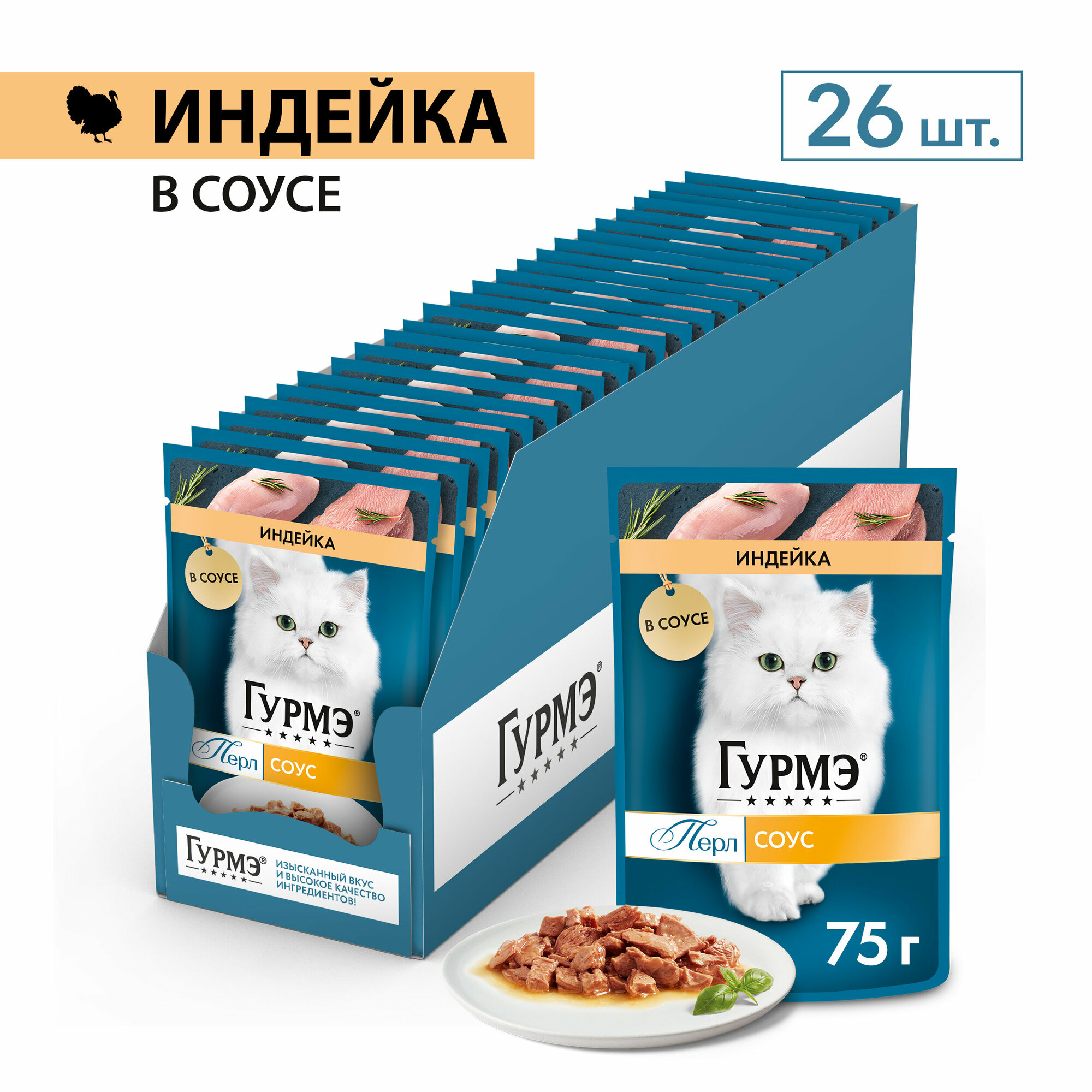 Влажный корм для кошек Гурмэ Перл Нежное филе, с индейкой 26 шт. х 75 г (кусочки в соусе)