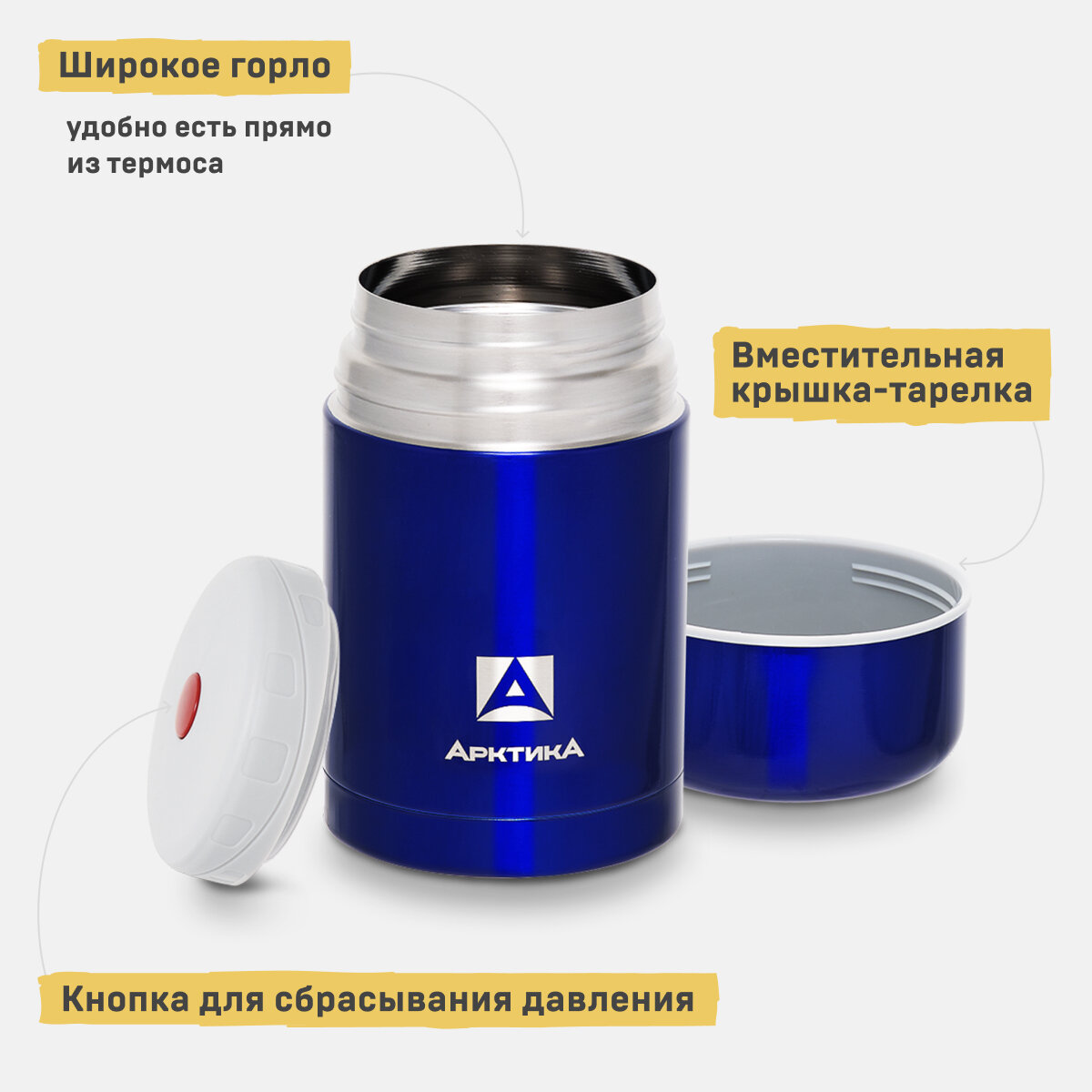 Термос "Арктика" с супер-широким горлом для супа и еды 302-750, синий, 750 мл (нержавеющая сталь, глухая пробка с кнопкой для спуска пара, цвет синий,
