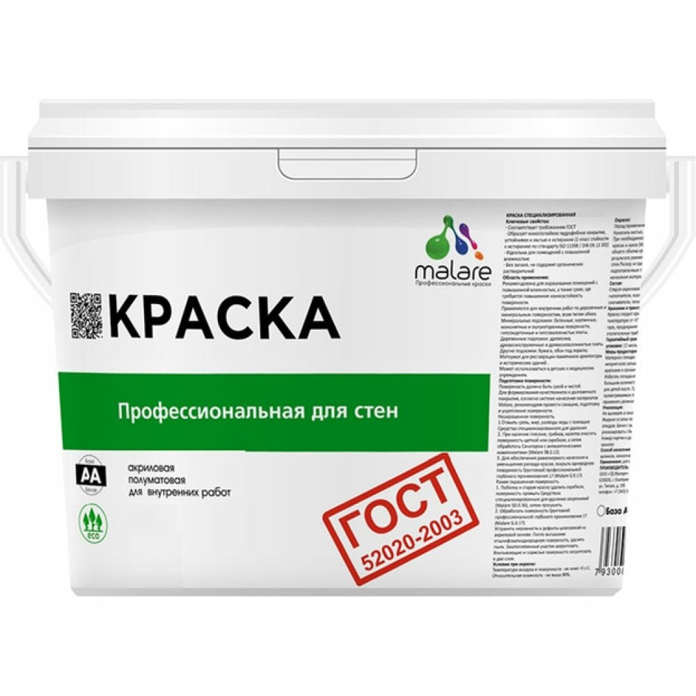 Краска Malare "ГОСТ" интерьерная для стен и потолков в сухих помещениях, быстросохнущая, без запаха матовая, белый, (9л - 13кг)