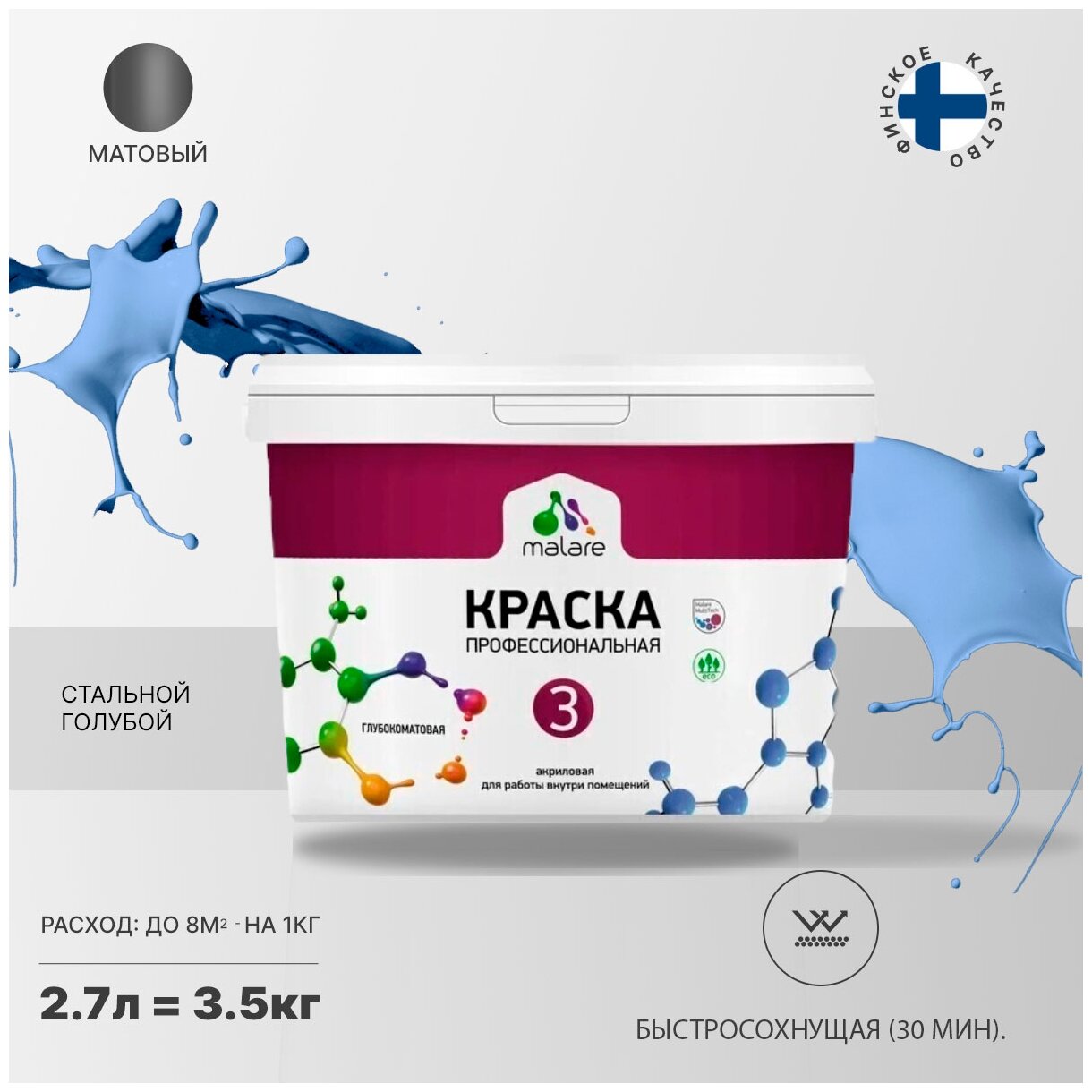 Купить Краска Malare Евро №3 для обоев, стен и потолков, интерьерная, быстросохнущая, без запаха, матовая, стальной голубой, (2.7л - 3.5кг).