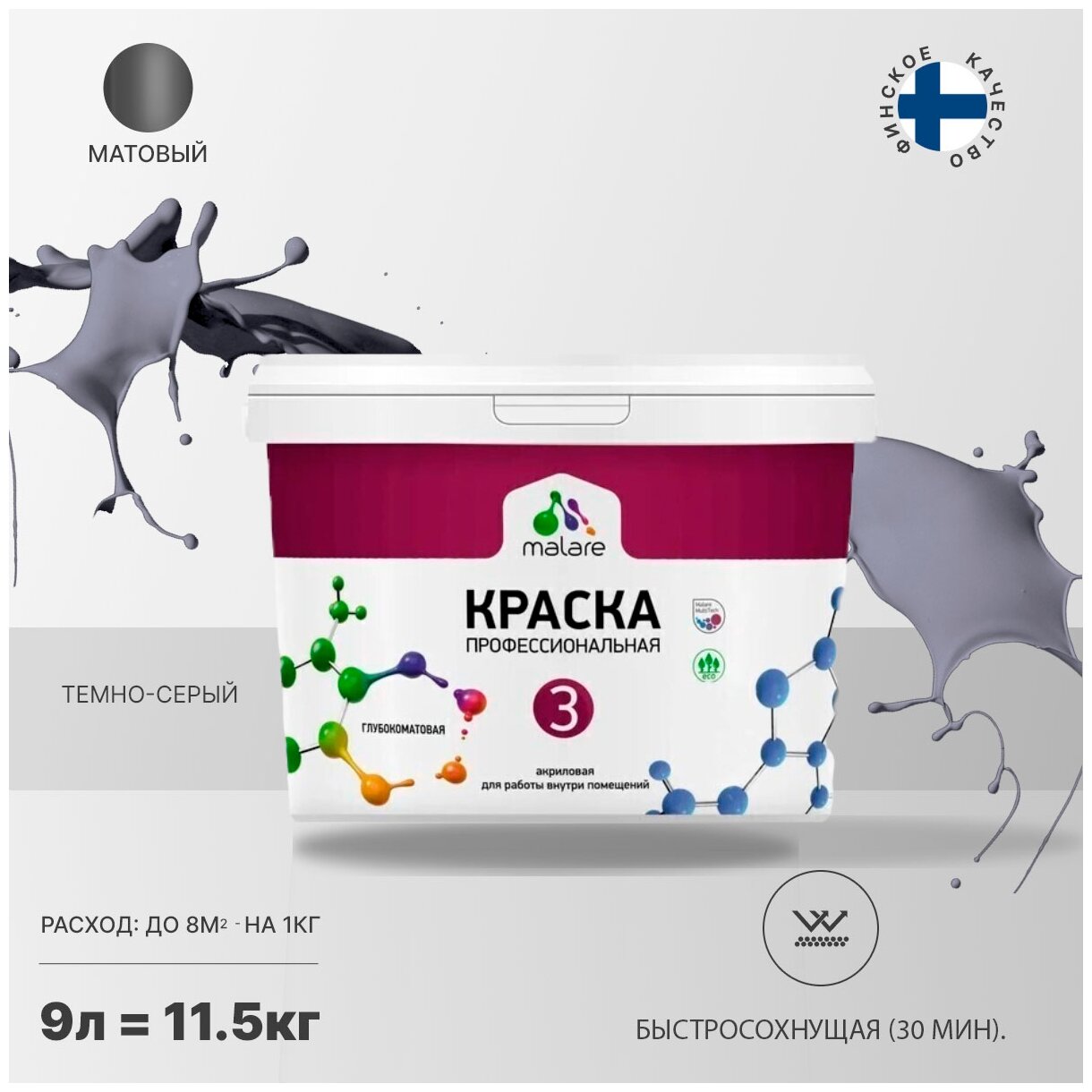 Купить Краска Malare Евро №3 для обоев, стен и потолков, интерьерная, быстросохнущая, без запаха, матовая, темно-серый, (9л - 11.5кг).