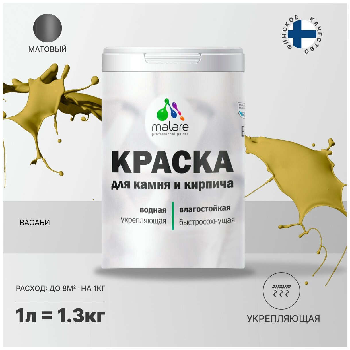 Краска Malare для камня и кирпича, по бетону и штукатурке, для минеральных поверхностей, водная быстросохнущая, без запаха, матовая, васаби, (1л - 1,3кг).