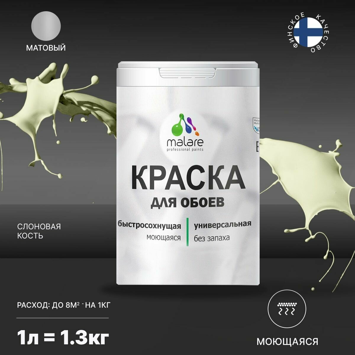 Купить Краска Malare для стен и обоев, потолка и минеральных поверхностей, быстросохнущая моющаяся без запаха матовая, слоновая кость, (1л - 1,3 кг)