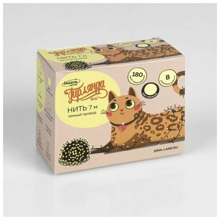 Luazon Lighting Гирлянда «Нить» 7 м, IP20, тёмная нить, 180 ламп, свечение тёплое белое, 8 режимов, 220 В