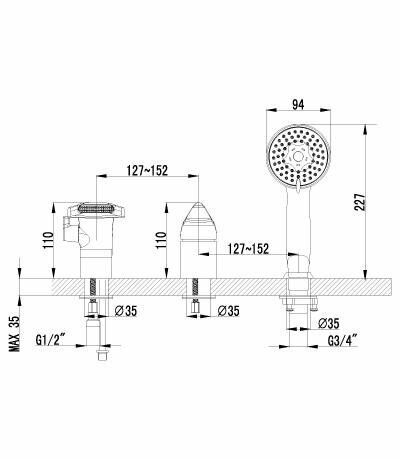 4245C Посейдон Смеситель для ванны встраиваемый, на 3 отверстия, с аксессуарами, хром LEMARK