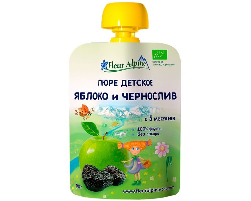 Пюре Fleur Alpine Organic (Флёр Альпин Органик) Яблоко и Чернослив с 5 мес 90 г (пауч) (6 штук в упаковке)