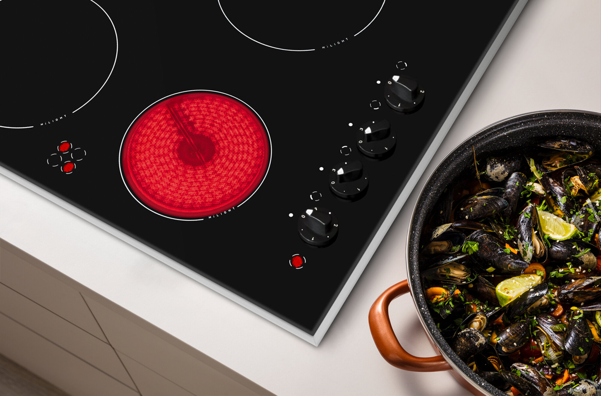| Плюсы: | Быстро нагревается и быстро остывает. Поворотные ручки имеют много делений степени нагрева. Индикация показывает остаточное тепло и включена ли панель. |