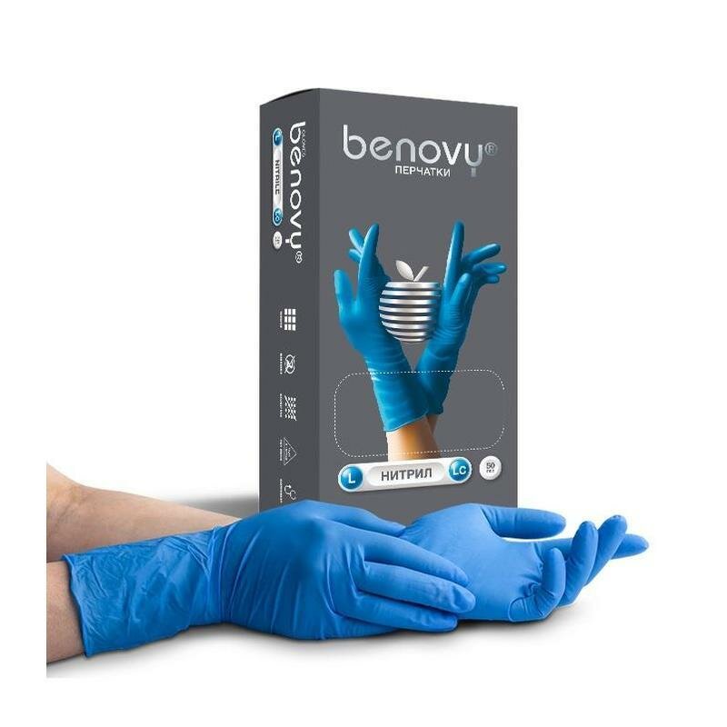 Перчатки одноразовые нитриловые смотровые Benovy, текстурированные, нестерильные, размер L (8-9), голубые, 50 пар