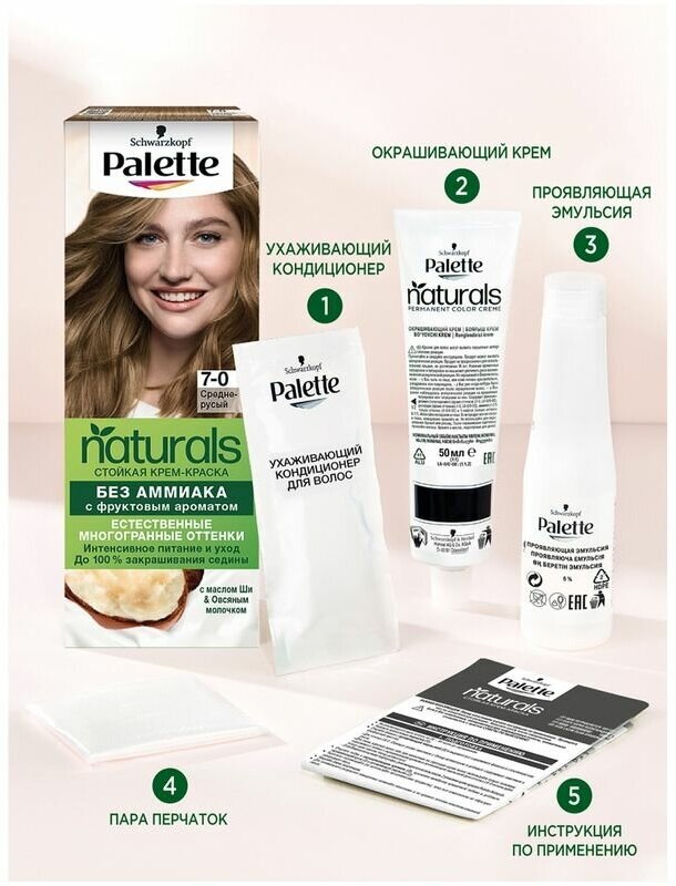 Палетт Naturia Стойкая крем-краска для волос, 7-0 Средне-русый, 110 мл - 6 шт