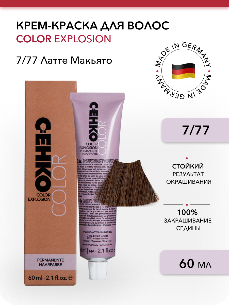 Профессиональная краска для волос 7/77 Латте Макьято, коричневый, шоколад, стойкая, перманентная, для седых волос, 60 мл, C:EHKO COLOR EXPLOSION