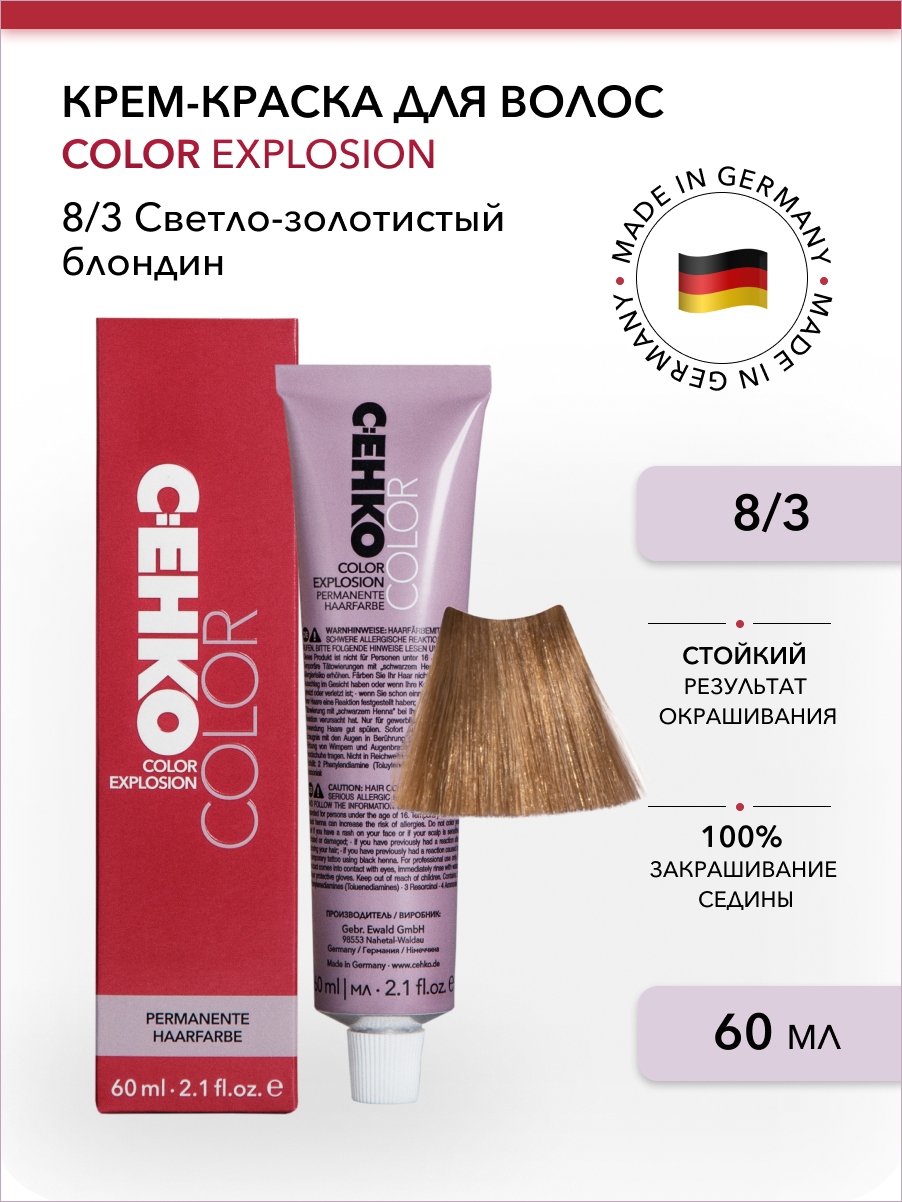 Профессиональная краска для волос 8/3 Светлый золотистый блондин, русый, стойкая, перманентная, для седых волос, 60 мл, C:EHKO COLOR EXPLOSION