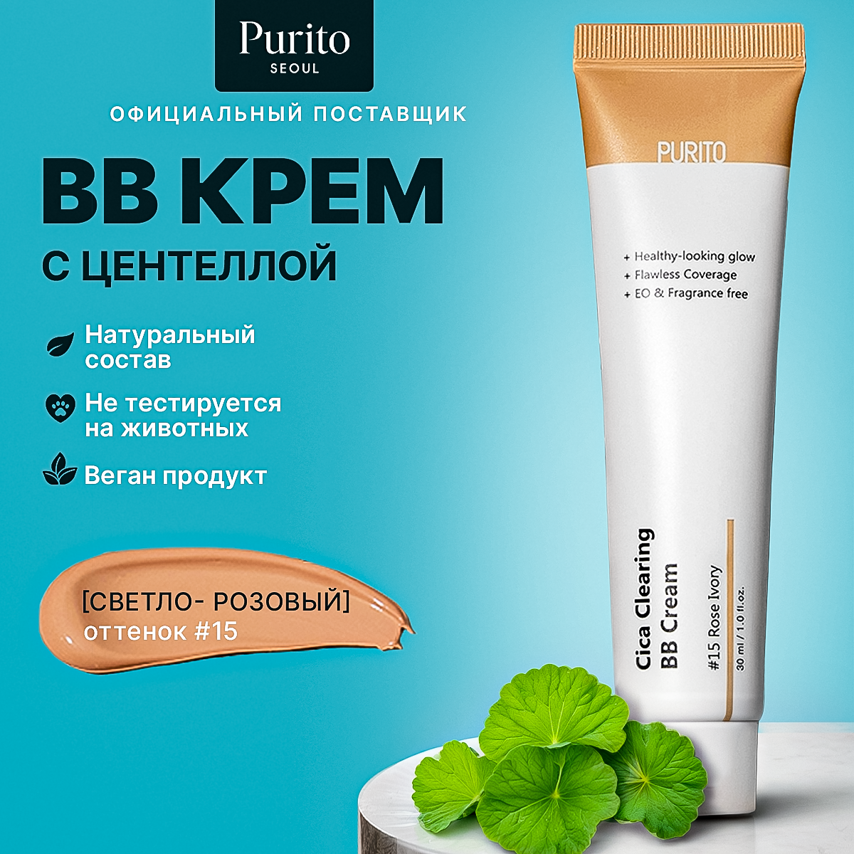 ББ-крем для чувствительной кожи с экстрактом центеллы PURITO Cica Clearing BB Cream #15 - Rose Ivory (30 мл)