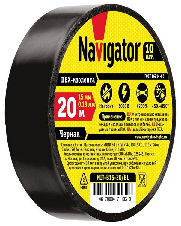 Ниже Вы можете прочитать отзывы на NAVIGATOR Изолента ПВХ 15мм (рул.20м) черн. NIT-B15-20/BL Navigator 71103, ознакомится с подробными характеристиками, посмотреть интересные обзоры и фотографии на NAVIGATOR Изолента ПВХ 15мм (рул.20м) черн. NIT-B15-20/BL Navigator 71103.