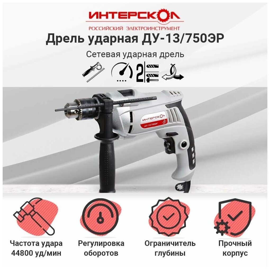 Дрель ударная электрическая ИНТЕРСКОЛ ДУ-13/750ЭР (750Вт, ключ патрон 13мм, металлический редуктор, 1,8кг, коробка)