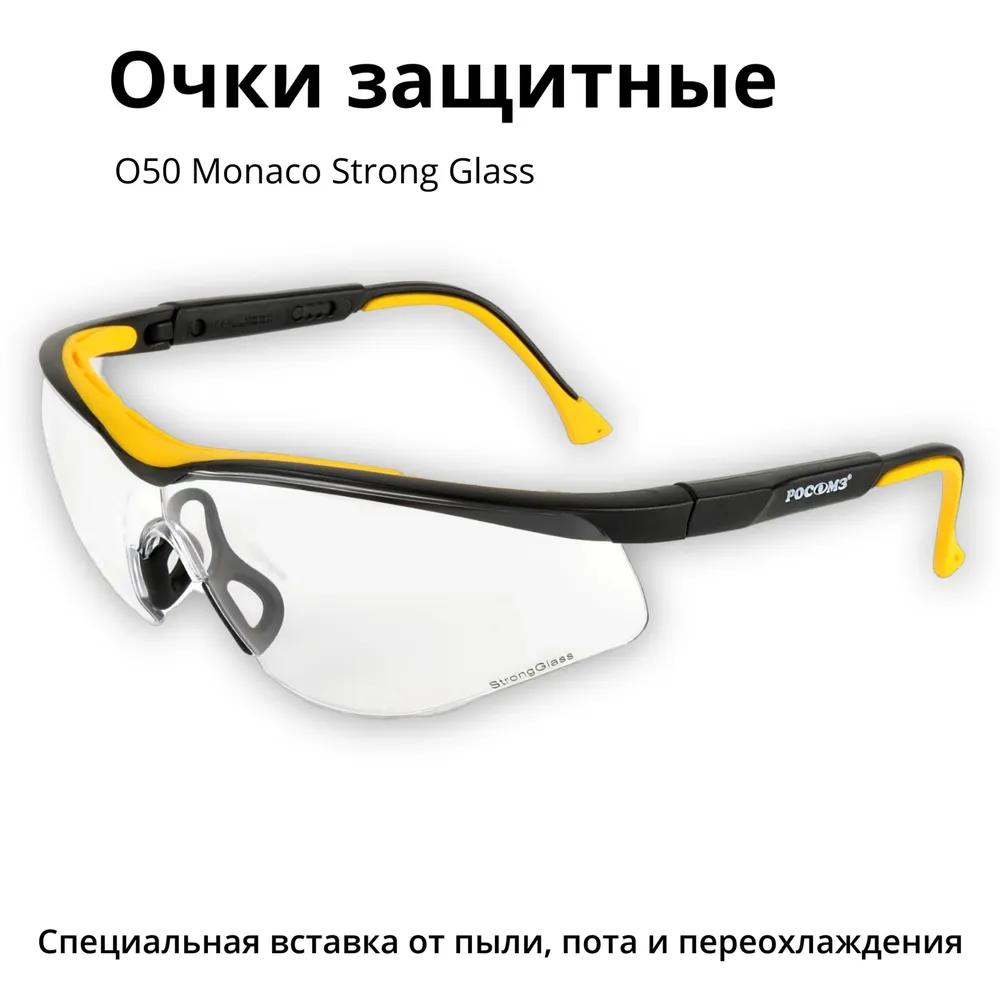 Очки защитные открытые РОСОМЗ О50 Monaco StrongGlass, прозрачные, регулируемые дужки, незапотевающее покрытие, поликарбонат