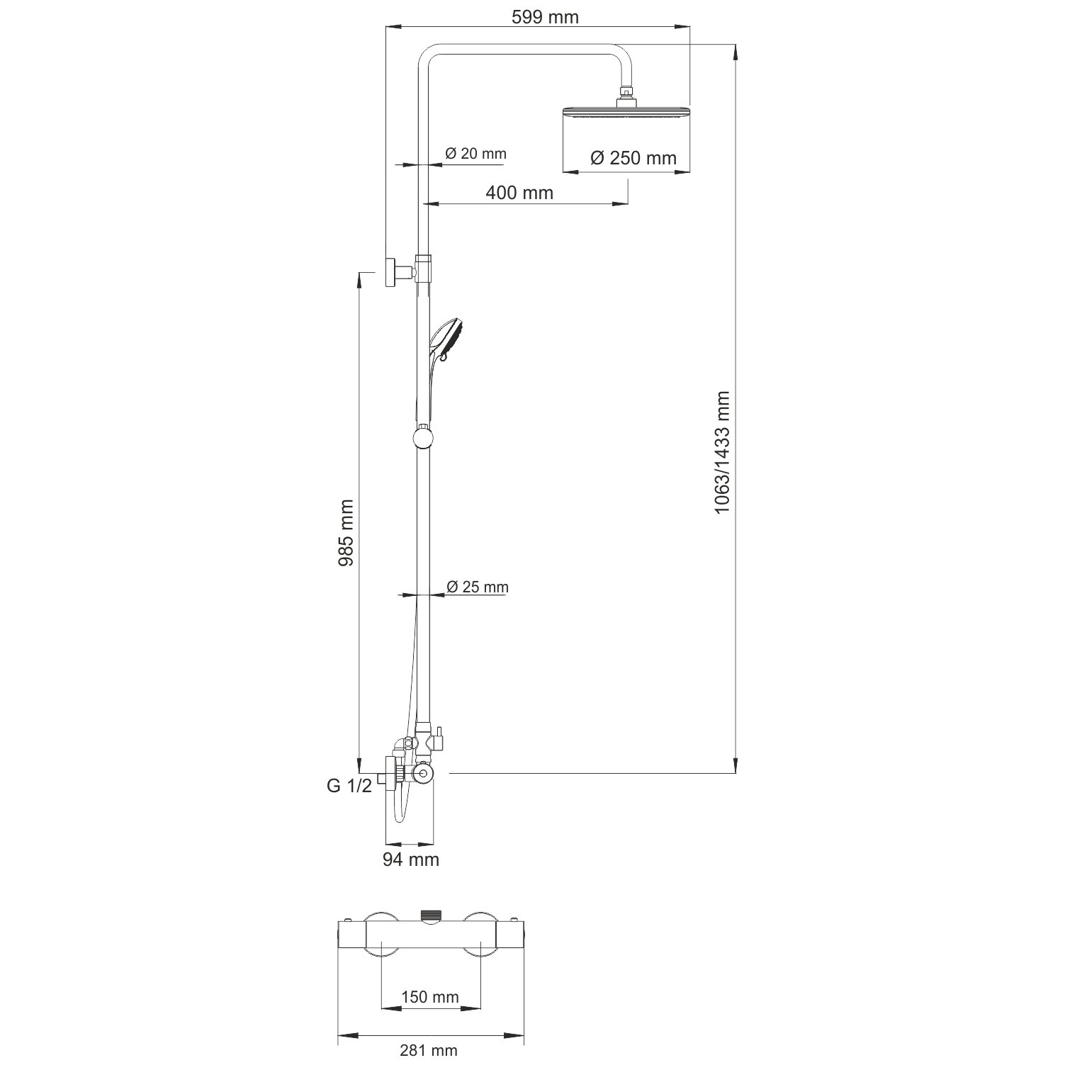 | Дополнительная информация | режимы потока воды от производителя: ливневая струя; покрытие: хром/никель; высота стойки для душа: 1433 мм; диаметр верхнего душа: 250 мм |