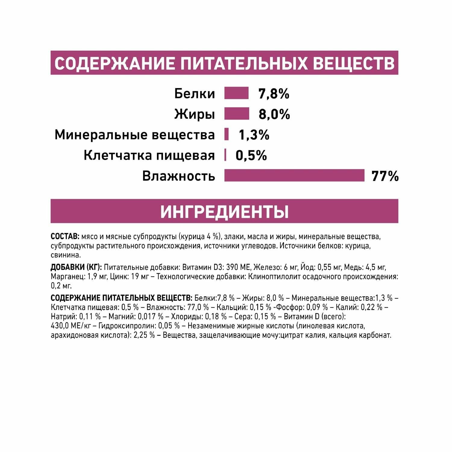 | Состав | обновленный: мясо и мясные субпродукты (курица 4 %), злаки, масла и жиры, минеральные вещества, субпродукты растительного происхождения,источники углеводов. Источники белков: курица, свинина. мясо курицы и свинина, пшеничная мука, подсолнечное масло, кукурузная мука, минеральные вещества (карбонат кальция, цитрат калия, цеолит), целлюлоза, рыбий жир, таурин, DL-метионин, фруктоолигосахариды (ФОС), экстракт бархатцев прямостоячих (источник лютеина), микроэлементы (в хелатной форме), витамины |