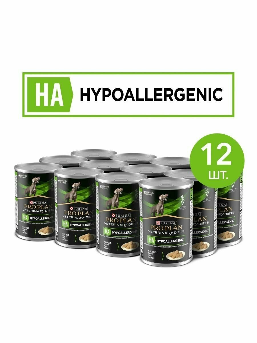 Влажный корм Pro Plan Veterinary Diets HA для щенков и взрослых собак, для снижения непереносимости ингредиентов и питательных веществ, Консерва, 12 шт. х 400 г