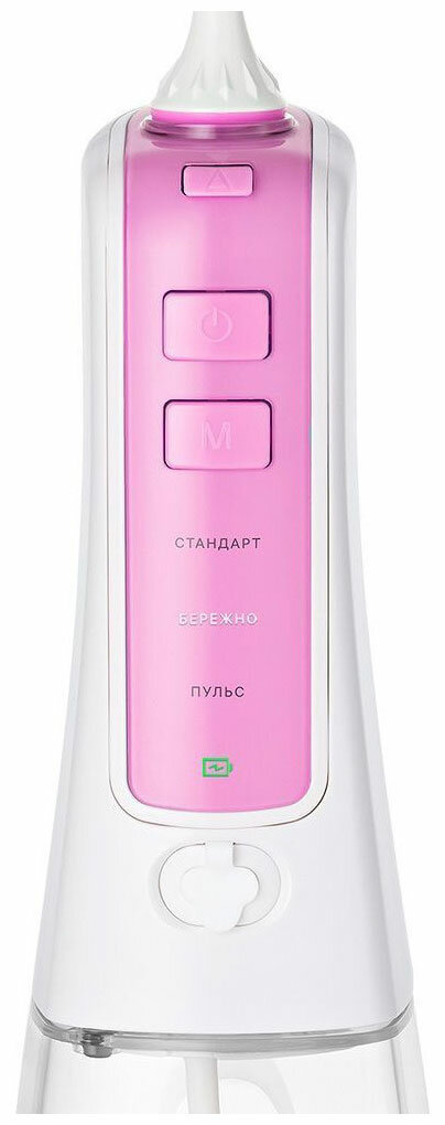 Ирригатор понятен с первых минут, нет нужды танцевать с бубном и инструкцией как часто это бывает. Три режима напора действительно отлично выполняют свои функции. В комплекте две насадки и что не мало важно, еще и чехол для устройства. Также провод для зарядки, важно не потерять его, так как он с разъемом специально для ирригатора. Отдельный лайк за розовый цвет.