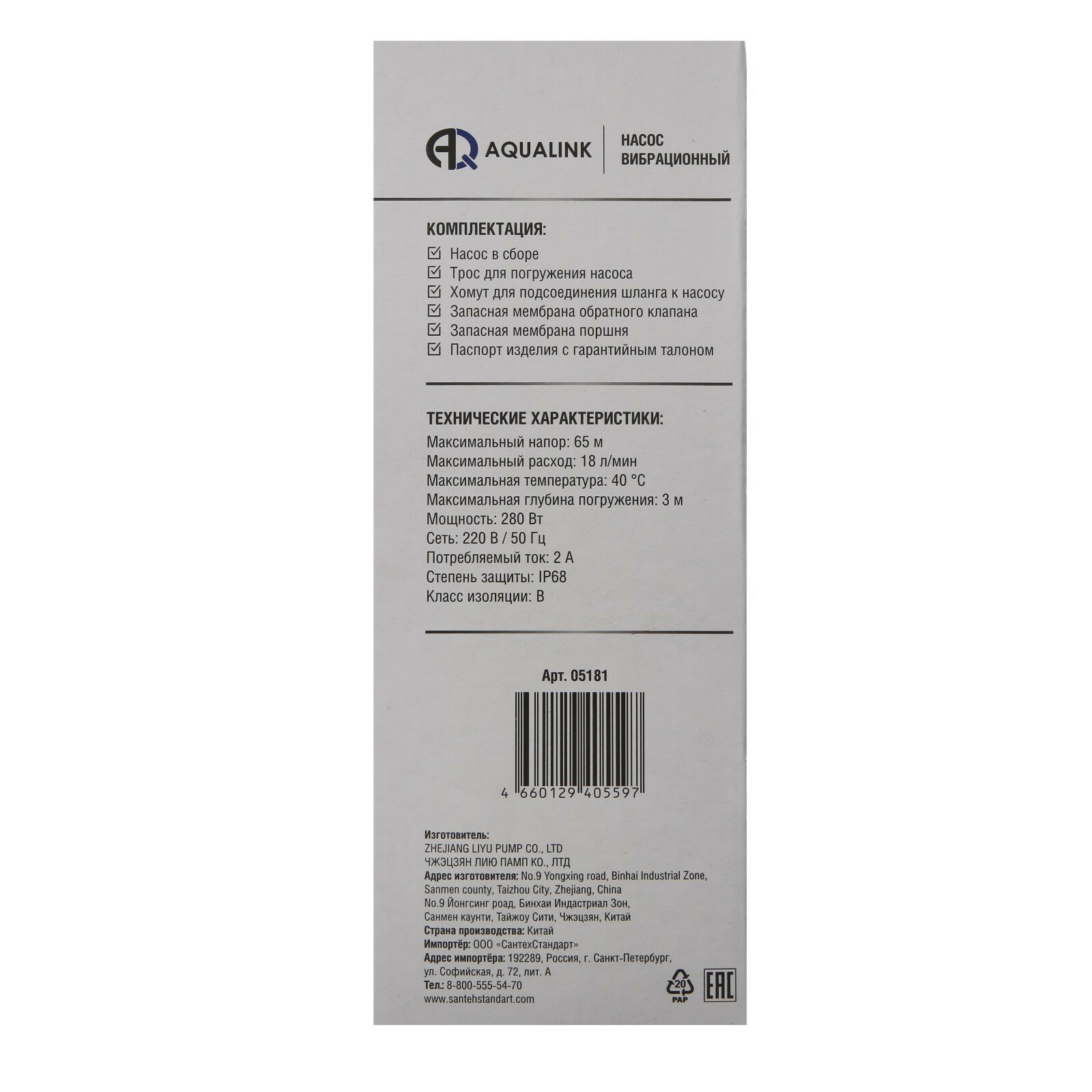 Насос вибрационный Aqualink VP U-65/18-16, 280 Вт, нижний забор, 18 л/мин, напор 65 м, 16 м Aqualink .